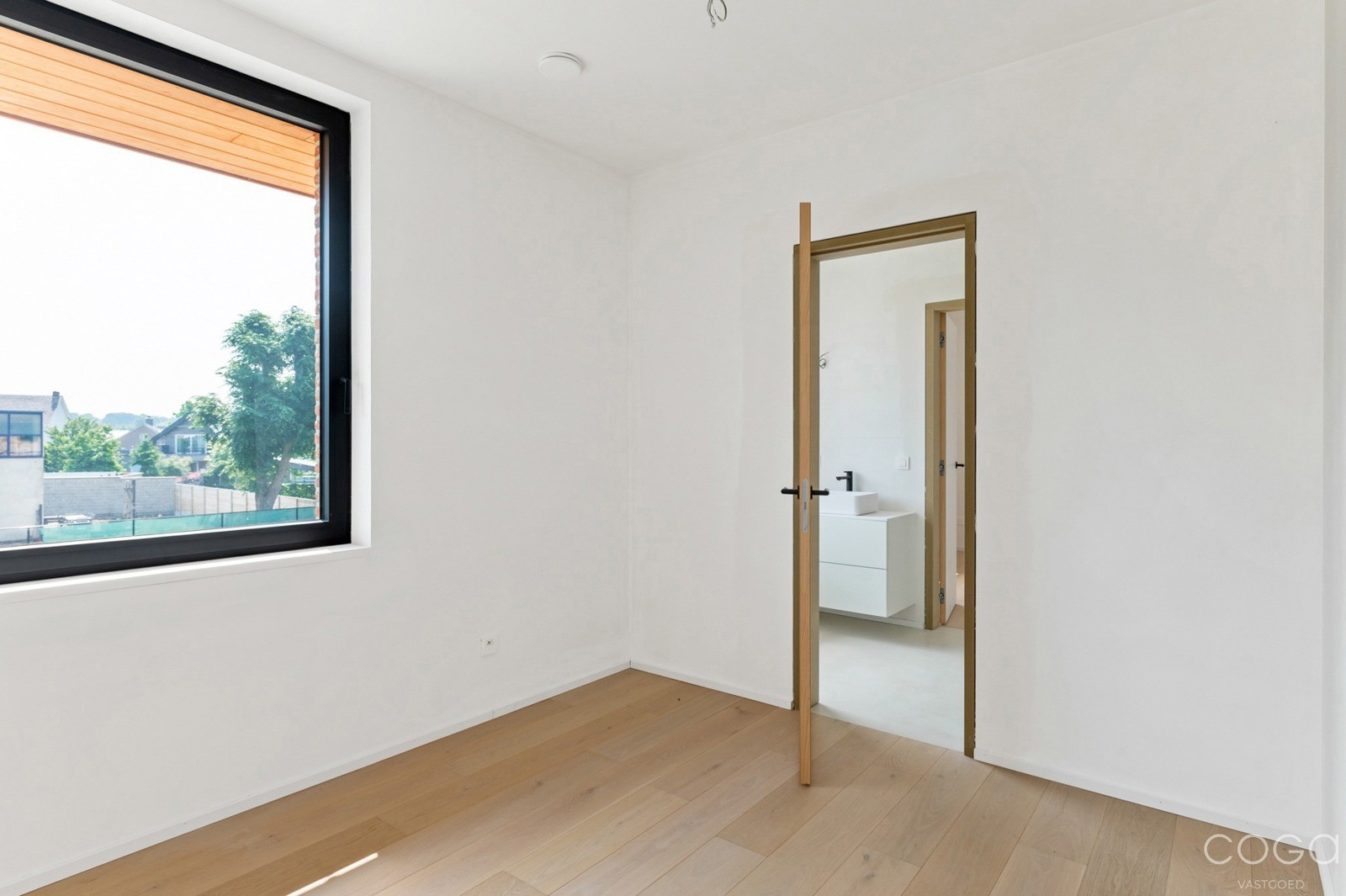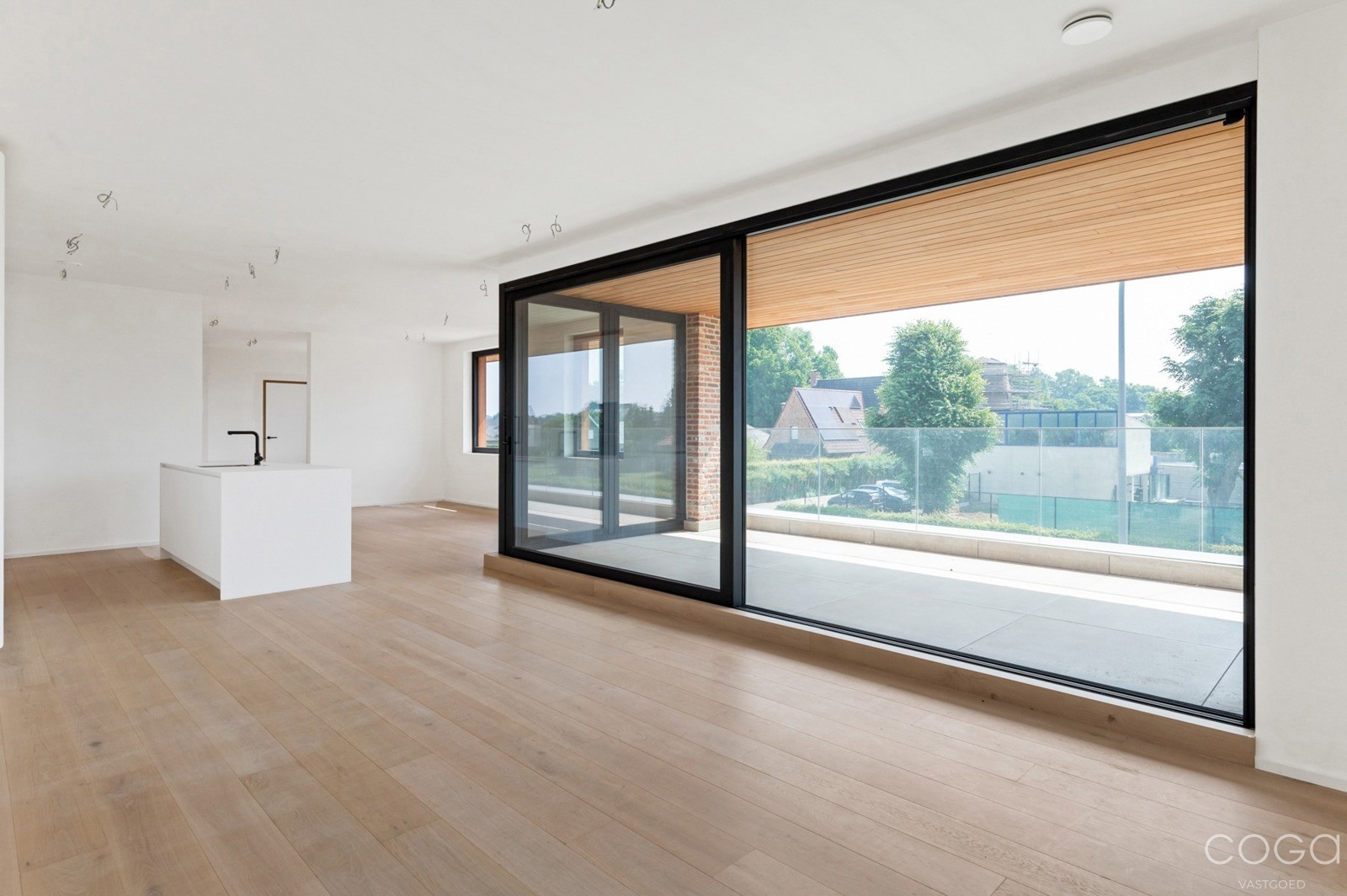 Inkomhal met apart toilet. De gezellige leefruimte van maar liefst 57m² omvat een zithoek, eetplaats en open keuken, allemaal op een stijlvolle parketvloer. De keuken is volledig uitgerust met hoogwaardige materialen en toestellen. Er zijn 2 slaapkamers (4 × 3,4 m en 3,38 × 2,8 m), met mogelijkheid tot het creëren van een derde kamer (momenteel ingericht als bureauhoek). Twee badkamers, waarvan één ensuite bij de hoofdslaapkamer, en een wasberging. Via het grote schuifraam in de leefruimte bereik je het aangename, overdekte terras.
