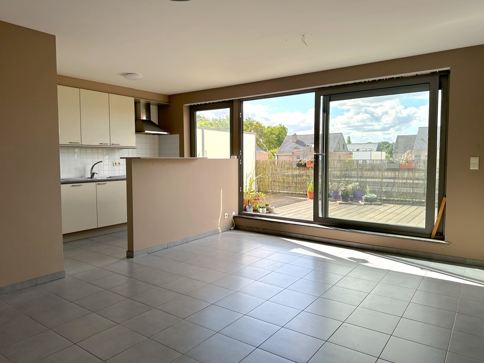 Bij binnenkomst kom je in de inkomhal die toegang geeft tot een lichte en gezellige woonkamer met open keuken, voorzien van alle nodige apparatuur. Aansluitend vind je een praktische berging/technische ruimte met de cv-installatie (2018). Via een schuifraam in de living bereik je het ruime terras met buitenkraan op het zuidwesten, ideaal voor zonnige momenten. De hal leidt ook naar een apart toilet, twee knusse slaapkamers en een badkamer met ligbad en douchescherm.