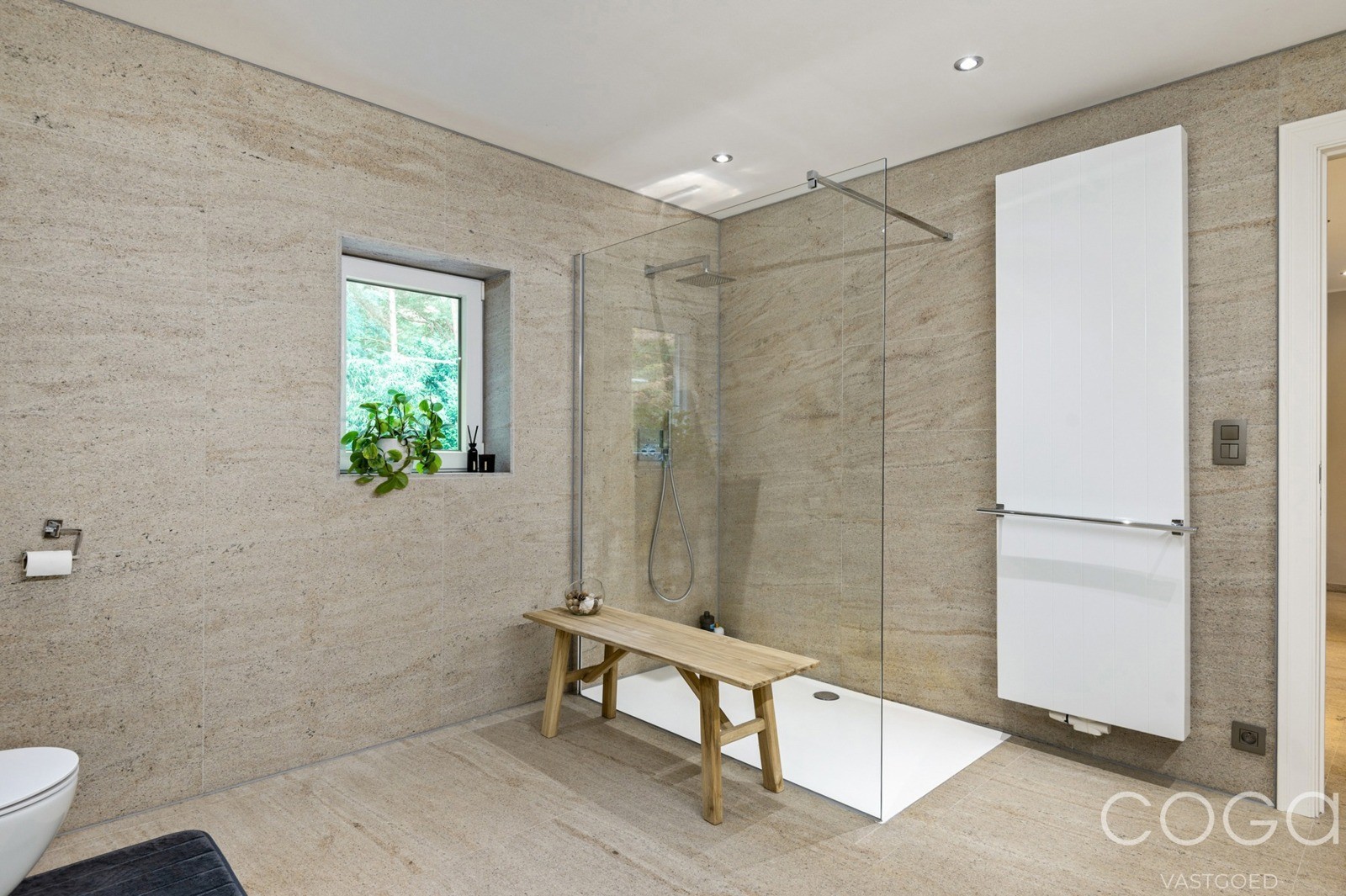 Vervolgens de luxueus afgewerkte badkamer ingericht met dubbele wastafel in een breed meubel met spiegelkasten – inloopdouche en toilet.