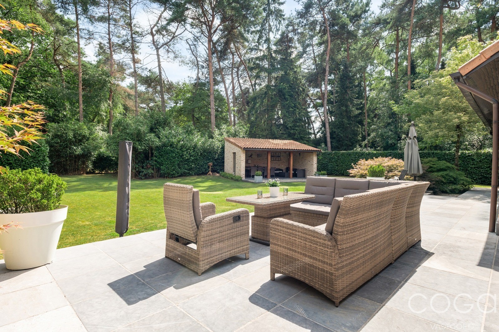 Het overdekt terras van ca. 25m² nodigt uit voor een gezellig samenzijn, een zomerse bbq, en geeft verkoeling wanneer het echt te warm is.