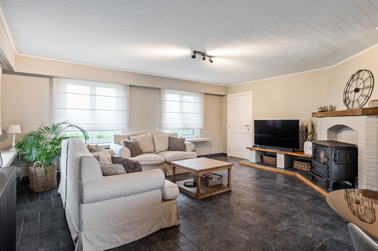 Deze goed onderhouden woning heeft een binnenruimte van +/- 300m² met volgende indeling: woonruimte (39m²) met zicht over de weilanden aan de voorzijde, leef-keuken (18,5m²) ingericht met kasten, inbouwtoestellen en werkblad in natuursteen, koele berging (4m²), aparte inkom achteraan met gastentoilet, ruime wasplaats (18m²) met CV en aansluiting wasmachine, inpandige garage (21m²). Vooraan een inkomhal met toegang tot het bureel of slaapkamer (15m²), badkamer ingericht met ligbad, douche en meubel.