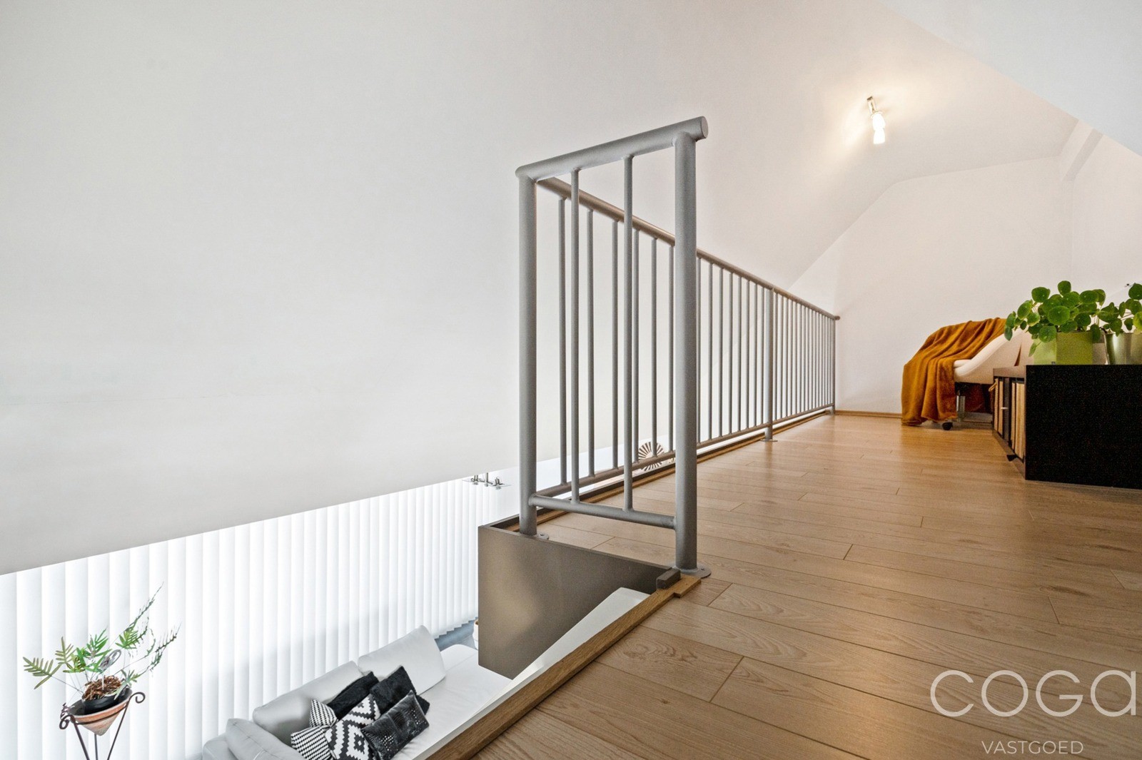 Een leuke extra is de mezzanine, bereikbaar via een trap in de leefruimte. Deze polyvalente ruimte leent zich perfect als bureau, leeshoek of extra bergruimte. Achter het gebouw bevindt zich het garagecomplex; een garagebox voor één wagen met elektriciteit is inbegrepen in de prijs.